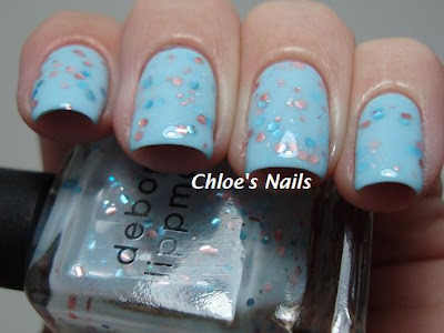I'm am so weak when it comes to Deborah Lippmann's glitter polishes. Man, why do they have to be so pricey though?!?!?! I was actually convinced that this one, I didn't need. That was until I saw so many pretty swatches of it, and I of course caved *sigh* This beauty is Glitter in the Air, it does have a very sheer/milky light blue base, so I first did a base of Sally Hansen Blue-Away, you can see my swatch of it